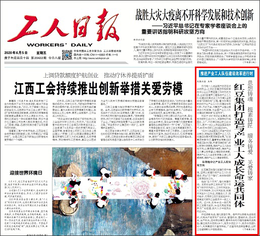 作為唯一入選全國(guó)產(chǎn)改項(xiàng)目試點(diǎn)的民企,江蘇紅豆集團(tuán)積極探索在非公企業(yè)開(kāi)展黨建工作的方式方法,出臺(tái)《黨建帶工建推進(jìn)產(chǎn)業(yè)工人隊(duì)伍建設(shè)改革試點(diǎn)工作方案》,全面實(shí)施“四鑄四有”工程,著力改革創(chuàng)新紡織行業(yè)產(chǎn)業(yè)工人隊(duì)伍建設(shè)體制機(jī)制、方式方法,為集團(tuán)產(chǎn)業(yè)強(qiáng)企提供動(dòng)力和保障,為全國(guó)產(chǎn)業(yè)工人隊(duì)伍建設(shè)改革探索“紅豆樣本”。