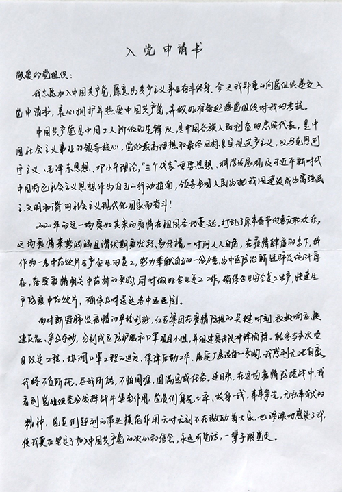 紅豆集團(tuán)國際公司的員工梁艷的再次向黨組織遞交入黨申請(qǐng)書的原因很簡(jiǎn)單,“為了支持一線疫情防控,集團(tuán)緊急組建黨員突擊隊(duì)支援防護(hù)服、口罩生產(chǎn)線,負(fù)責(zé)最緊急、最艱苦的工作。我也報(bào)名了,因我還不是黨員,所以沒有把最重的任務(wù)安排給我?!笔艿缴磉咟h員的激勵(lì),讓梁艷鼓起勇氣,擬出了這份“疫情火線入黨申請(qǐng)書”。