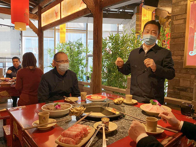 為餐飲行業(yè)打CALL!3月15日星期天中午,紅豆集團董事局主席兼CEO周海江帶領(lǐng)集團黨員干部來到剛剛恢復(fù)營業(yè)的無錫東港紅豆萬花城蜀大俠火鍋店,通過測溫、掃錫康碼包括手部消毒后進入店堂點餐消費,以實際消費行動支持中小企業(yè)的復(fù)蘇。